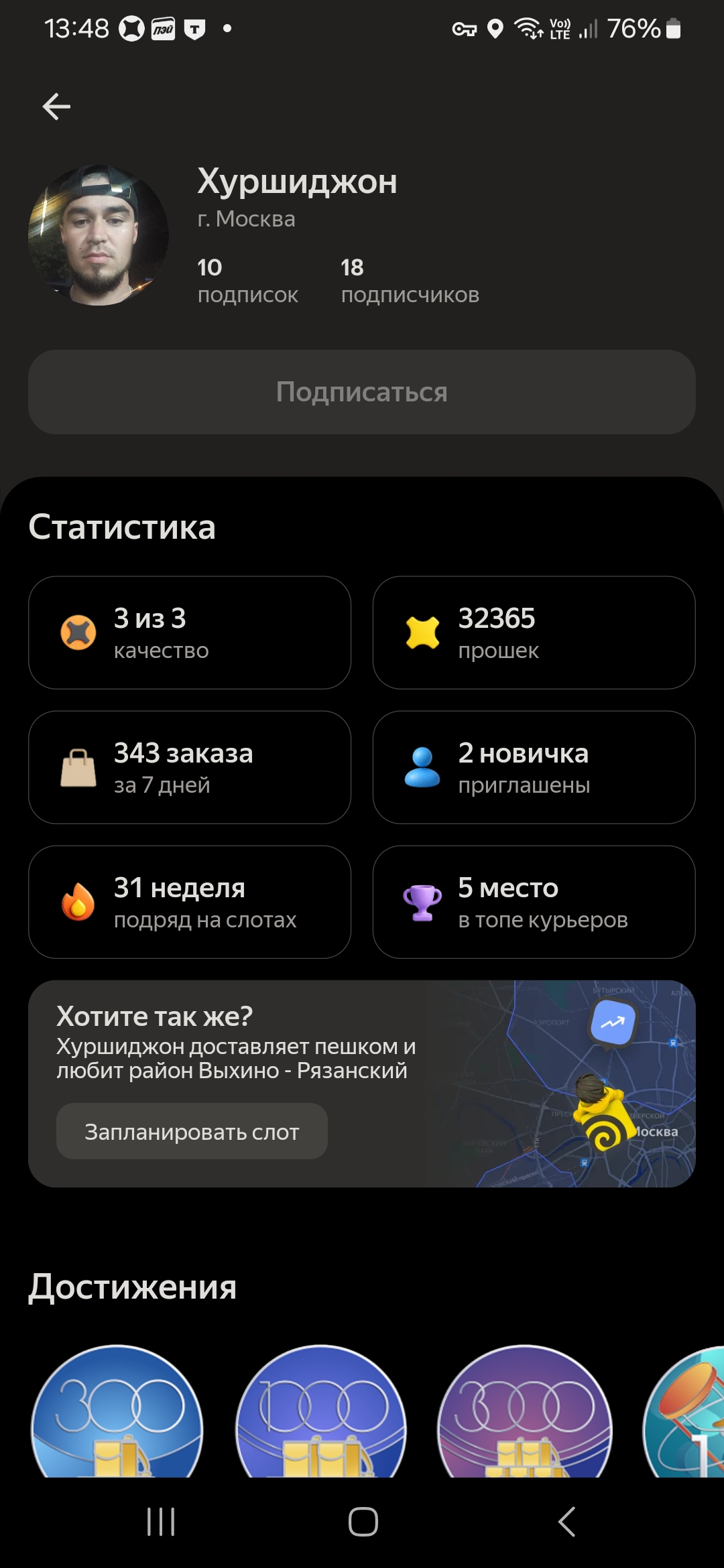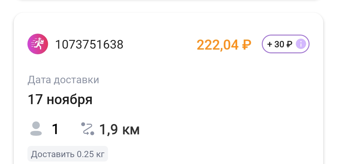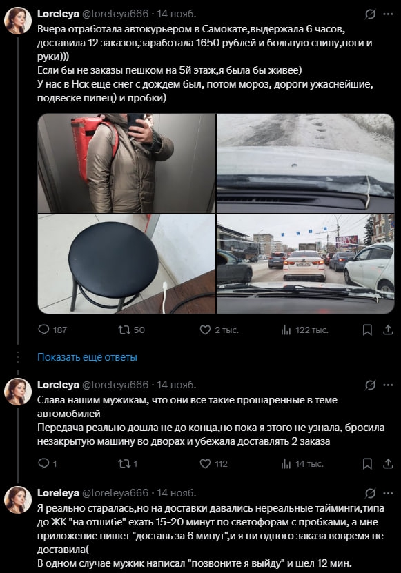 Ну что, сегодня погонял покурьерил первый день пешим кружочкодавом. До этого нигде не быкокнутился. Вроде норм, 320 рублей в час где-то выносил. Холод не мешал, подштаники, кофта и зимние ботинки, -3 градуса, город полумиллионник. Все везде пиздец добрые, какие-то гирляндочки, скрабики, да игры настольные детские. Одному мужику свитер нёс, но он так, бирку глянул, примерять не стал, забрал. Бывало, на телефон не отвечали, 3/9 заказов не дозвонился, но идти до них было по 3-4 минуты, домофоны и хаты уже норм открывали, так что за 9 ходок ни одного возврата или брака. Тянки на пунктах добрые, улыбаются, пакеты сами дают по несколько штук. Из проблем - поясница на третий час начал млеть, ибо протрузан давнишний, но млеть начала не из-за веса носимого, а потому шо на ногах долго, а моя основная работа сидячепердячая. Вторая проблема - куча закрытых дворов, которые надо постоянно обходить по 5, а то и по 10 минут. Типа 6 подъездов по 15 этажей, под 700 хат. Хз от кого там заборы нужно ставить, если в таких массивах сам по себе кто угодно может жить уже, а я обходи заборы эти, моментом думал уже перелезать начать через них. Радужный в общем первый выход, даже как-то подозрительно, хотя я и ходил по неплохому району. В 10 минутах езды в другом районе к 21 часу заков 10 ещё точно висело невывезенных. Если бы часов 6 ходил, мб и их сделал бы. Завтра на два часика выйду, после смены больше не успею, посмотрю как в понедельник будет. Планирую по ходу холодания утепляться, чтобы лутать побольше заков без конкуренции. Но если не выйдет, то поставлю себе предел в условные -15 - -10 градусов хотя бы при намёке на дискомфорт.