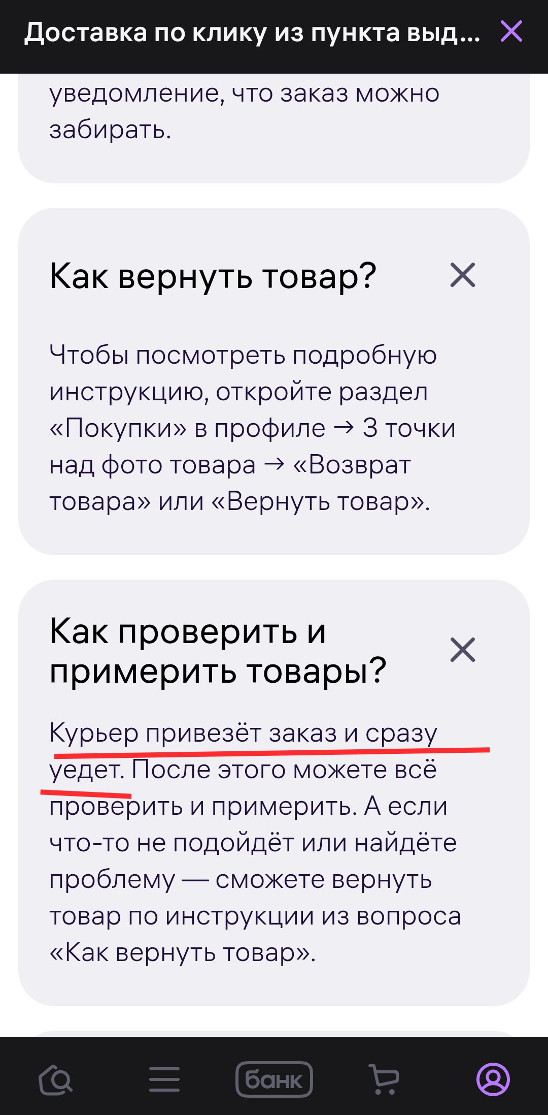 скрин1. При постоплате сначала списываешь бапки с клиента и только потом передаёшь ему. А при оплаченной технике клиент может осмотр сделать. Скрин2 У хуесоса есть 10 мин на прмерку Еще там же в приложении есть инфа где написано что кура отдает шмотки и съябывает сразу, без примерки. Путанная хуйня у конторы пидарасов
