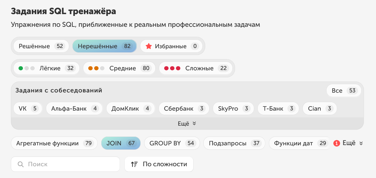 >>3223009 Там еще проблема в том, что: 1. Нет доступа к документации. Поменял вкладку чтобы вспомнить сигнатуру какой-нибудь функции? Задание не засчитывается. 2. Чувствуются искусственные усложнения задачек: какие-то условия вроде "округли до такой-то точности" или "обработай граничные условия". Это не про скилл написания самого запроса, а просто знания функций самого SQL. 3. Нет автодополнения кода, что дает минус к и так крошечному времени на эти задачи (35 минут на 4 задачи)
