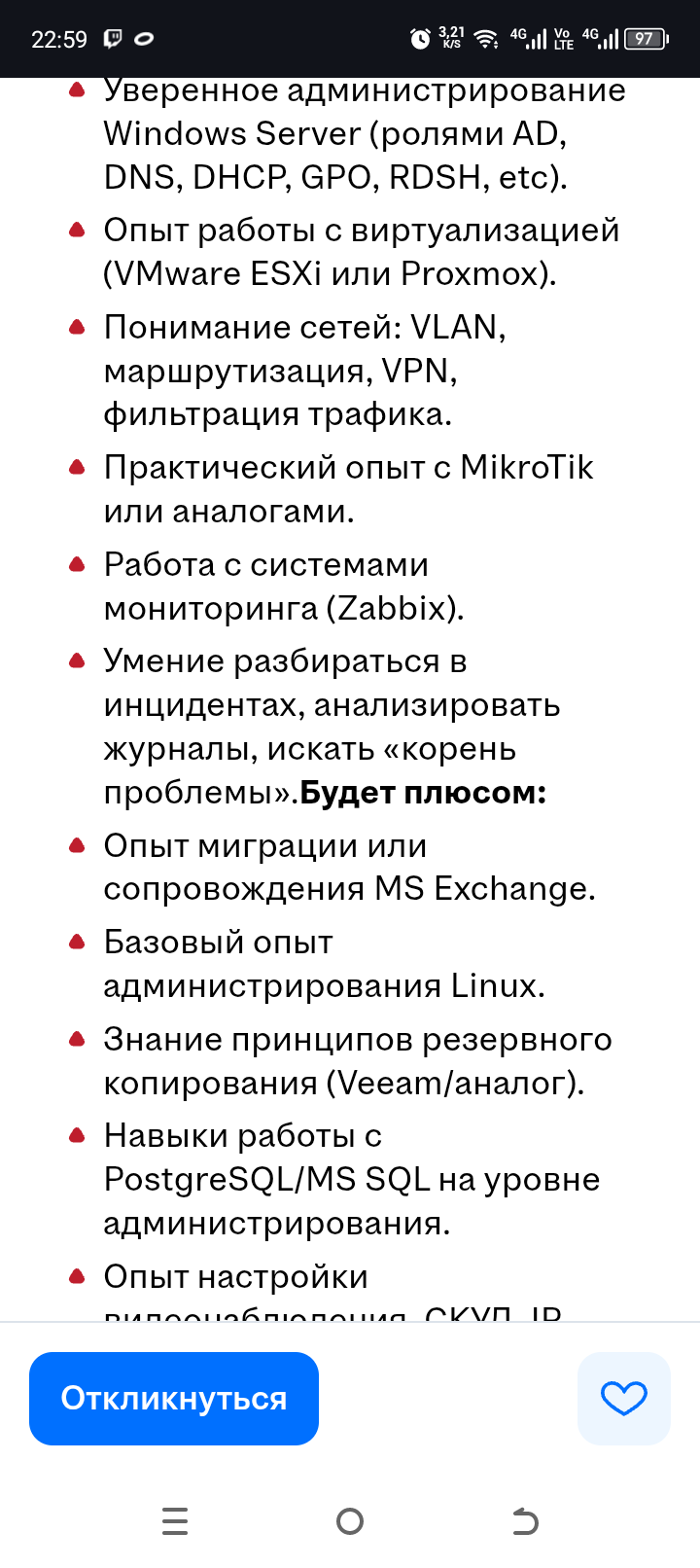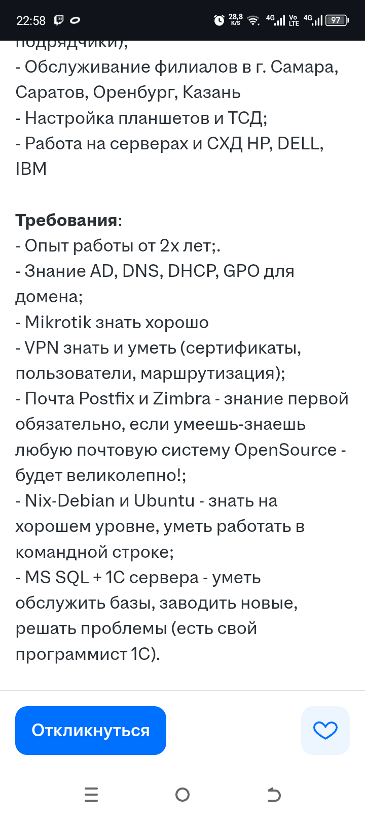 >>3224429 За 100К это дохуя работы. Виртуалки и кластеры на проксмокс, какая нибудь почта которую надо связать с АД, межсетевой экран на винбоксе, бридж возможно + VPN, заббикс это вообще не для рядового админа тема, на какой то хуй вписали базовый опыт администрирования линукс хотя по списку там уже минимум на среднем+ знать, еще postgre с mssql запихали, значит надо будет еще работать в mariadb, ldap, на php писать и прочая веб дрочь. Еще хотят битрикс с 1С втюхать, шок просто. Но тащемта похуй, осилить можно, но блять за такую зп это просто пиздец.