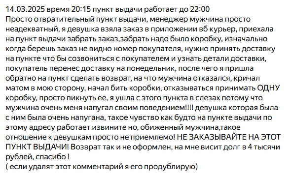 >>3237829 Еби ПВЗшника заказами на этот ПВЗ с забором и выставлением рейтинга в одну звезду. Только не заказывай на тот же телефон, с которого ты работаешь на всякий случай. Адрес тоже желательно светить не тот же, который у тебя в WB Курьер. А мы адрес указывам вообще? А клиенты, если сами забирают? Я уже забыл. Можно ещё друзей-знакомых-девушек-дедушек-собак подключить к этому процессу, чтобы эта охуевшая скотобаза вообще завыла и в ноги тебе бросилась.