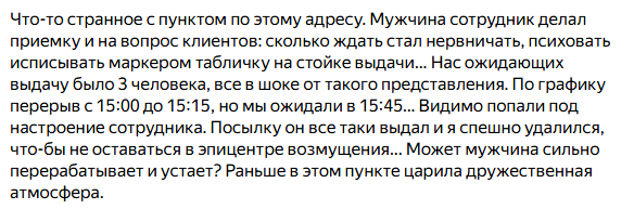 Закончил работать часа в 2 дня. Сейчас зашел в приложение, смотрю, там до сих пор висит незакрытый возврат, я аж обосрался. Это причем самый первый заказ сегодняшний, в 9 утра был, не подошли ей блять сапоги. Очистил кэш, перезагрузил - смотрю, все принято. Отлегло