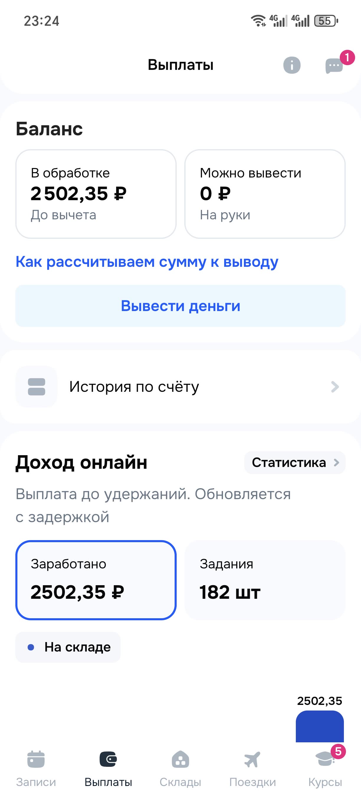 Q)А по выплатам что? А)В отличии от Озона, заработанная сумма в приложении показывается уже за вычетом налога. Но есть нюанс: в приложении есть две плашки Тарификатор и Баланс. После смены деньги идут в Тарификатор и лежат там 2 дня. В течении этих 2 дней с Тарификатора могут вычитать штрафы. На 3 день все что осталось от ваших денег за вычетом штрафов переходит в плашку Баланс. Баланс уже является неприкосновенным и из него ничего не вычитают. Дальше можете либо копить деньги на Балансе, либо вывести их на карту почти любого банка там большой список банков. Можно выводить деньги по сбп.