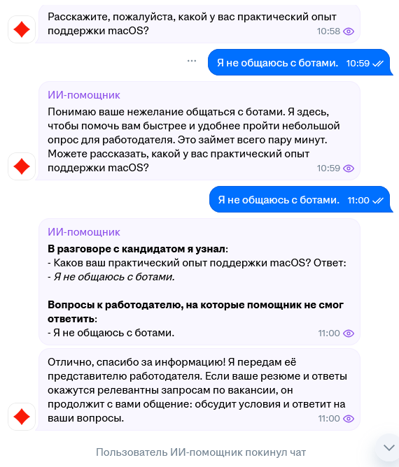 >То есть ты можешь просто на вакансию откликнуться из профиля компании, а не трещать с ботов Можешь, но тебе ответит этот ИИ-бот вместо HRюшки. И диалог будет такой же как тут на скрине. ---> >>3263282 Разница только в том, что если ИИ-помощник тебе напишет, то он сначала даст краткое описание вакансии.