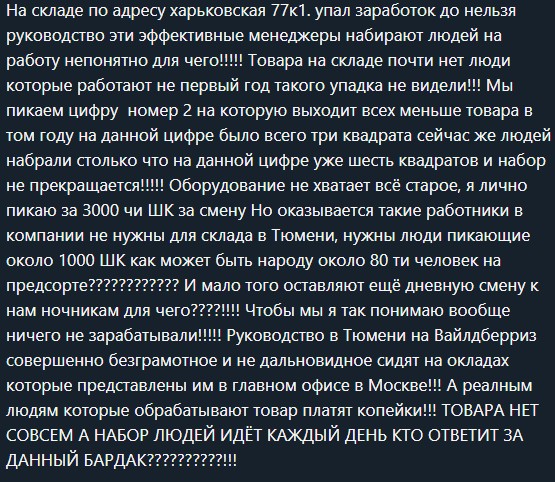 >>3264115 Не работал, заходил туда года полтора назад. На Харьковскую 77, кажется, или 71. Сейчас там вроде еще один сц открыли, но это не точно, давно не интересовался и там я уже не был вообще. Зашел короче, там охрана, объяснил ему что я работать вроде как, он сказал "жди, ща начальника смены, или какого-то такого хуя, позову". Ждал где-то час по итогу. Подошел мужик, уже плохо помню что именно мне он там говорил. Но что запомнил: в среднем зарабатывают по 5к, смены только в графике несмотря на то что гпх договор, график ночной или дневной на выбор, вроде 2/2 с 8 до 20 и 20 до 8, но если я хочу нормальный "палец", то надо приходить раньше всех, приду поздно и будут только разъебаные, тсд нет и работать надо со своим личным телефоном на андроиде. А и еще по 5к делают на коробочной сортировке (КС), но это "мазаное" место и чтоб он туда поставил надо сначала проявить себя, плюс дождаться пока кто-то оттуда уволится, потому что все в графике и места как бы расчитаны и подписаны. Меня же он поставит на предсортировку. Сколько там зарабатывают, на этой предсортировке, я не понял, хотя спрашивал. Мужик как-то юлил отвечая на этот вопрос. Но думаю, что меньше 5к, раз юлил и раз на "мазаном" месте получали около 5к. Да и в целом, видел как люди там сидели и бесцельно шатались видимо в ожидании пока работа появится, тогда как люди на КС работали, что-то пикали. "Палец" это если что сканер который на палец одевают, его через блютуз подключаешь к своему телефону, на телефон дадут вб-шную програму скачать. Я короче договорился встать в смену в день, которая через два дня должна была стартануть. Пока этих два дня сидел дома, обдумал все еще раз. Понял, что я не хочу свой личный телефон использовать для работы на каком-то сраном складе, что его надо будет еще как-то дозаряжать потому что он вряд ли 12ч работы протянет. Что я не верю этому мужику даже в оплату про 5к, очень уж мутно и неуверено он все говорил, что я наслышан что там штрафы есть и от этих 5к поди останется 4к, в лучшем случае. И что он же меня даже не поставит на это сладкое место, он ставит меня на какую-то хероту где люди сидят в ожидании работы и что в реальности там будет тыши 2 по итогу. И что я так-то не хотел в графике работать и именно поэтому рассматривал для себя вб, и что если уж работать в графике, то можно и другую работу найти за потенциальных 2к рублей. В общем да, я так никуда и не пошел по итогу и забил на вб. С тех пор еще видел в новостях некоторый скандал на счет того что сотрудники работают в графике 2/2, имея договор ГПХ. Но не в курсе привел ли этот скандал к отмене графиков. И тсд с тех пор может быть и закупили и не надо теперь с телефоном работать. Да и по оплате за это вермя могло все поменяться. Нашел отзыв с нытьем, который написали в феврале. В общем сомнительная тема, но можешь попробовать сходить, узнать. И может быть даже выйдешь хотя бы на одну смену в отличии от меня, чтоб проверить на личном опыте что там с оплатой, потому что я так и не рискнул выходить пикать.