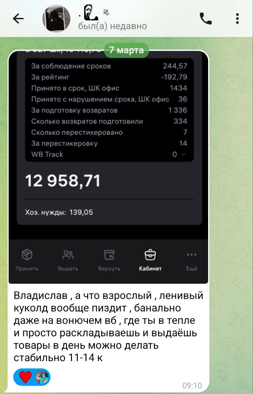 Ехал недавно на склад ВБ на такси с посонами, в автобус не смогли пробиться. Один из них интересным челом оказался.От него несло перегаром и он постоянно смеялся.Рассказывал что все карты заблокированы, но озоновскую и вбшную пока не трогают. Сказал что работает в основном на озоне,потому что там кормят бесплатно и деньги через 3 часа после окончания смены можно выводить.Видимо зарабатывает себе на бутылку водки и домой. Да уж, а по рассказам на озоне более приличный народ,студенты.Возможность вывести деньги через 3 часа это ведь прямо рай для маргинала...И на рейтинг ему пох говорит, уже -1500. У нас на вб интеллегенция работает, по сравнению с этим гражданином.Я даже таджиков немножко зауважал, а что, ходят чистые трезвые опрятные...