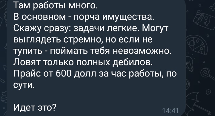 >>3272007 По моему это пиздец как дёшево. Или ты думаешь "задания" там будут : насрать на коврик перед дверью, прорезать колеса машины, облить человека зелёнкой? Как раз за 600 баксов и можно максимум пакости школьников делать. Логически подумай сколько стоит машину поджечь? Думаю тысяч 200+ начинается ценник за дно матиз блять. А если там мерседес стоит за 6 лямов?