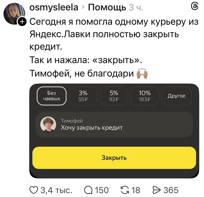 Отьебашил сегодня. 40 заказов. Сегодня система додо легла, по симу было дохуища опоздания(по факту не опоздали, но отметить заказы не могли). Алсо отношу заказ, там время доставки с 15:30-16:00, я приехал в 15:25, захожу в подобие развлекательного центра для детей и бабы начала : "Какого хуя вы так рано привезли мне, у вас же указано, что нужно с 15:30 до 16:00, понанимают дебилов в эти ваши додо, кококо пук среньк". Впервые за 4 года РАБоты в курьерстве такое быдло. Сеймы?