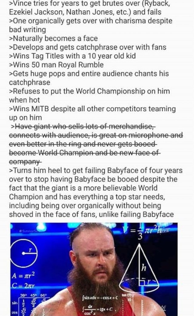 Леснар vs Рейнс. Брок умер после всего лишь трех супермен панчей два из которых явно промазали и четырех спиров. Наверное перед матчем чем-то отравился. Градус неадеквата после перехода титула должен снизиться, но как бебифейс Строман будет убивать бебифейс Рейнса, мне решительно непонятно.