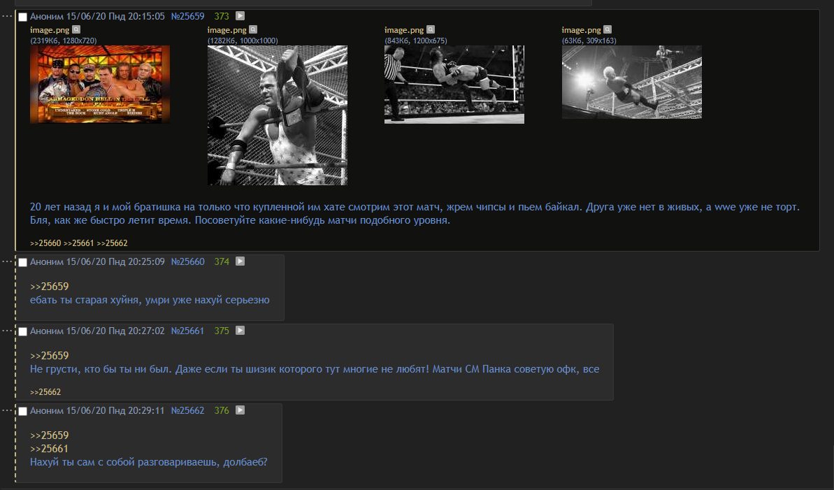 20 лет назад я и мой братишка на только что купленной им хате смотрим этот матч, жрем чипсы и пьем байкал. Друга уже нет в живых, а wwe уже не торт. Бля, как же быстро летит время. Посоветуйте какие-нибудь матчи подобного уровня.