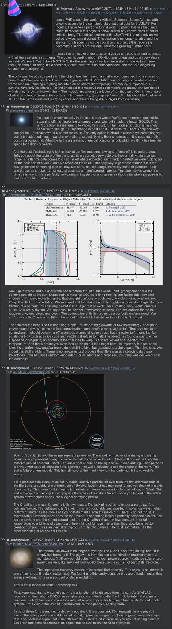 Официальная позиция заключается в том, что 31/ATLAS — это уникальная активная, но в остальном естественная комета. Эта позиция определенно несостоятельна и молчание руководства о своем когнитивном диссонансе, который для этого требуется, становится серьёзной профессиональной проблемой для всё большего числа из нас.