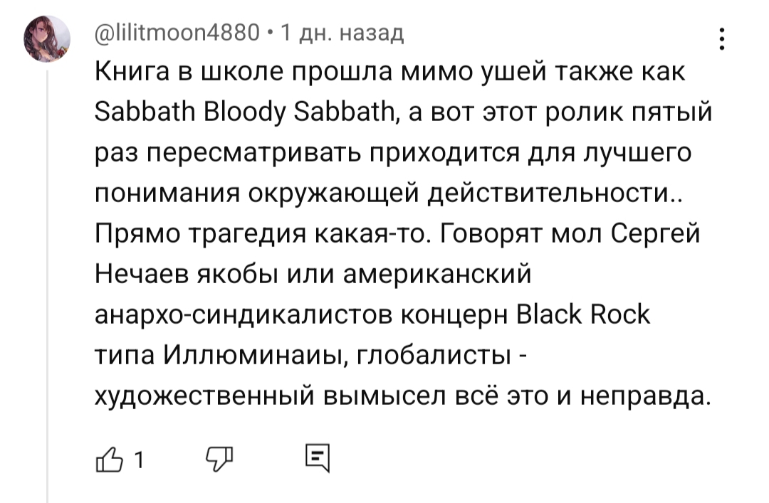 О чем речь в этом комментарии, что за сабатт, что за анархо-синдикалисты илюмминаты из американского концерна с которыми связан Нечаев? Нихуя не понял, разжуйте