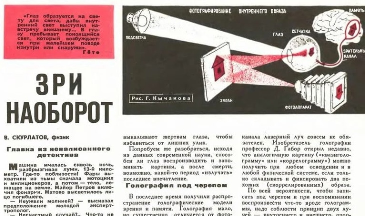 — Мысль материальна — к этому пришли уже многие ученые. Все энергии ядерные и исходят из первоисточника. А первоисточник — это психическая энергия. Оказывается, этой энергии полно в космосе. Японцы сразу подключились к моим исследованиям, открыли по ним лаборатории. Также их открыли в Канаде и Англии. В нашей стране я до сих пор не могу открыть, — рассказывал психиатр во время интервью. — Что же видит глаз? Либо лучи, отраженные от предметов, либо солнечные лучи попадают в глаз. Он воспринимает это роговицей, прозрачным стеклом, которое направлено в этот мир. Далее лучи проецируются на сетчатку хрусталиком как линзой. Здесь световые импульсы переводятся в нервные импульсы. Они идут по зрительному нерву и посылаются в наш мозг. В нем находится зрительный центр, он обрабатывает полученную информацию, и мы осознаем то, что видим. Но может быть и наоборот — зрительный центр может послать импульсы на сетчатку. И тогда сетчатка спроецирует в пространстве изображение — то, что осталось в зрительном нерве.