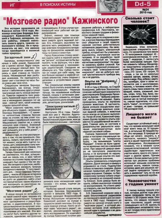 Кажинский это коллега профессора Крохалева. Однажды Кажинский услышал необычный звон и на основе этого пришел к выводу, что мозговое радио существует. А дальше Кажинский стал изучать феномен мозгового радио и изготавливать экранированные камеры как профессор Крохалев, в которых гипнотизировал собак. Опыты в экранированных металлических клетках убедительно показывали, что феномен мозгового радио реально существуют, что полностью сходится с открытиями профессора Крохалева.