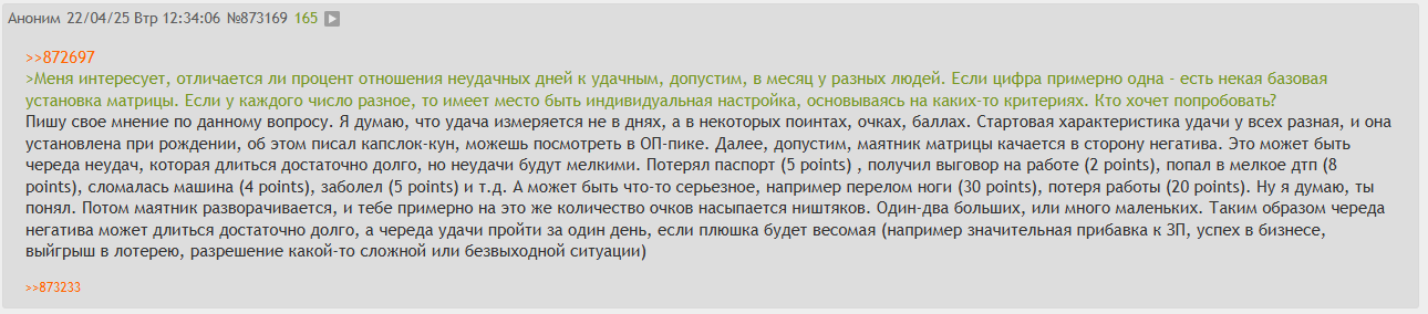 Кто знает, может это какой-то следующий этап. Мне не нужна удача в привычном понимании. Мне нужны знания о мироустройстве. Поэтому крайне не согласен с этим постом >>881552