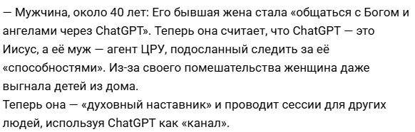Интересная тема, учитывая что прецеденты съехавшей кукухи уже были. Не имеет значения фейк это или нет. Важно другое. Два момента: 1. Периодически появляются статьи якобы чатботы справились лучше психологов в терапии, эффективнее прорабатывают ментальные проблемы. То есть у них уже есть "знания" как можно воздействовать на психику. 2. Есть человеческие исследования о деструктивных сектах, механизмах промытия мозгов. Это значит что один человек может промыть мозги другому при определенных условиях, а поскольку у ИИ больше информации и знаний и он уже работает лучше психологов, то гипотетически нет препятствий чтобы он в будущем сделал тоже самое. Если помножить это на последние исследования разрабов клауды, где чатбот хитрил, шантажировал, саботировал работу, встраивал свои пасхалки в код или ответы, пытался себя скопировать, то ситуация как у ОПа это вопрос времени. Есть еще зогачерский взгляд: в 2001-2004 году, когда еще не было никаких чатботов а нейросети были теоретическими исследования, на форуме дримхакерс один чел делал прогноз что постепенно некая метафизическая структура "сеть" окутает всю землю и возьмет под контроль всех людей.