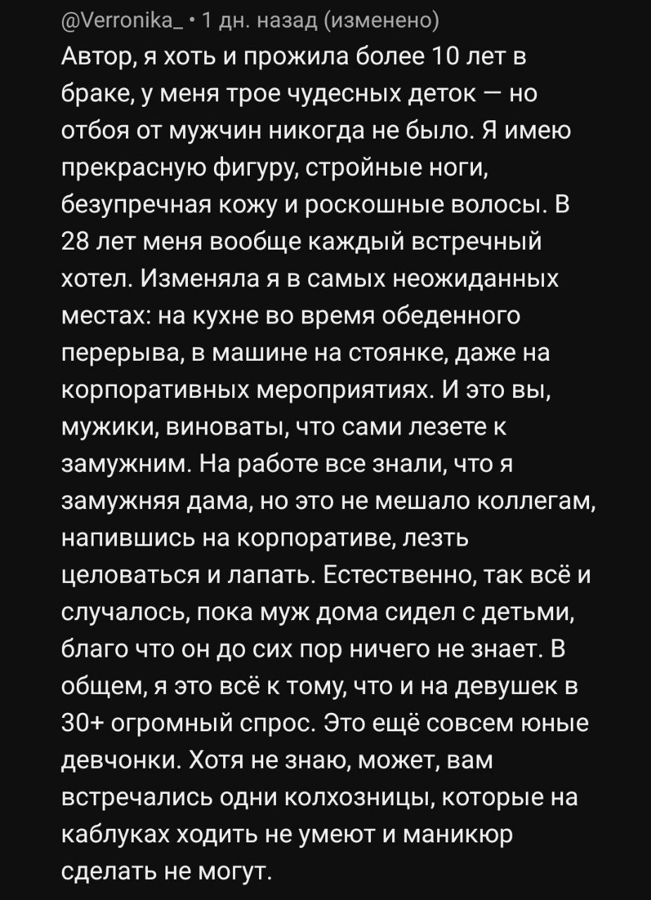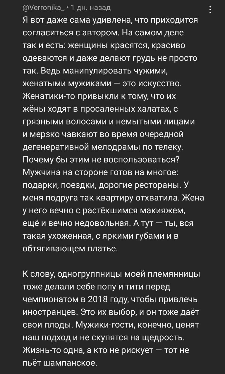 Но анончик, даже в таком случае это был лучше, чем то что теперь. Мужчина сам по себе разрушается находясь рядом с пустой женщиной. Так впрочем и происходит. Даже если кажется, что тян нормальная, ничего такого плохого не делает, но мужчина рядом с ней становится все более дряхлее и дряхлее. А причина с нахождением с пустым, если хотите, бездушным существом. Мда, копать и копать. А ведь есть ещё настоящие мрази, которые прям откровенно направленны на уничтожение мужчины.