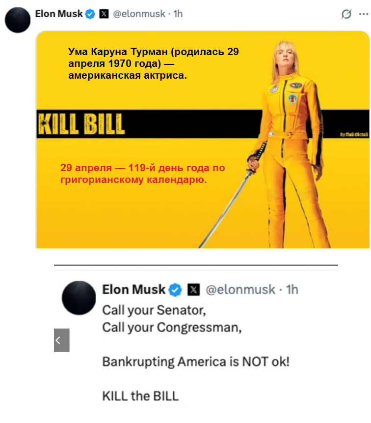 Это интересно после твита Маска "Kill Bill", где он просит звонить всем и вся( см пикча). Но только от даты теракта с пейджерами до его дня рождения опять код 911( 9 мес 11 дней)