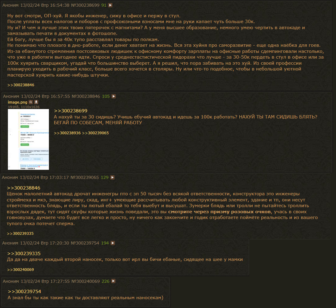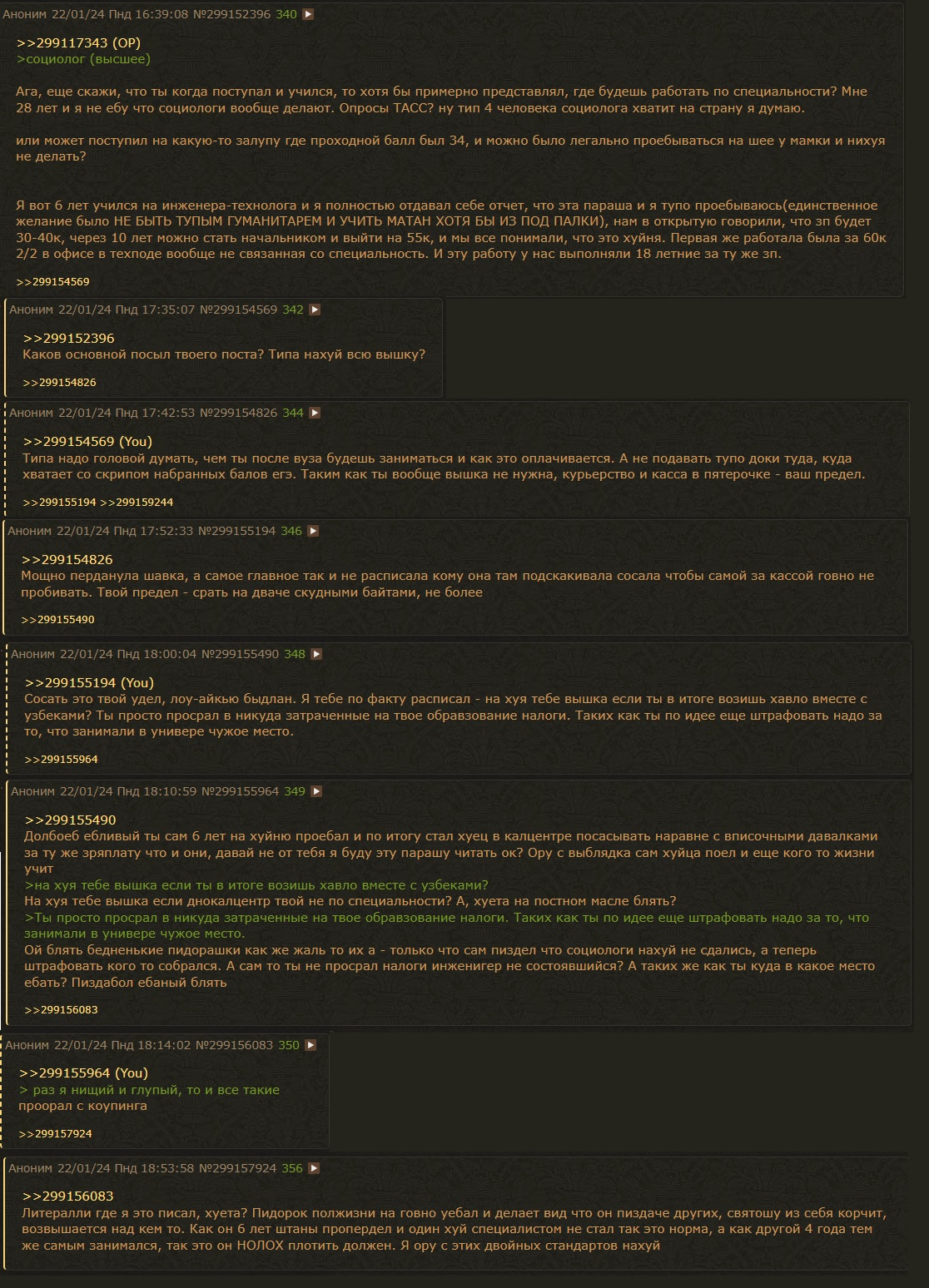 >>721455 Включи логику. >200к зарплата >тяжёлая умственная работа >отправили учиться на последние деньги Он или начальник штаба батальона мобиков. Или особист-контрразведчик в зоне СВО. >>721446 Ну так с такой зп он может быстрее приобрести базовый набор нормиса (квартира, дача, авто) и после 40 послать всё нахуй и перейти просиживать штаны за меньший оклад, сохранив нервы и здоровье. >>738945 Аминь >>738955 Стань профи, найди непыльную работёнку и развивайся. Если хуярить на дно-работе по 12 часов с одним выходным, то без разницы бакалавр ты или с непооным средним. Деградация будет одинаковой.
