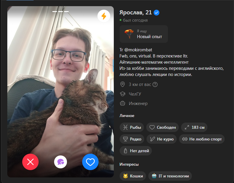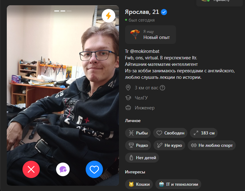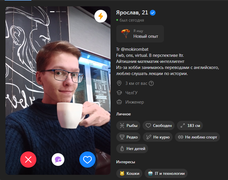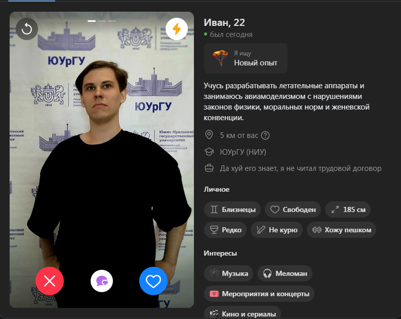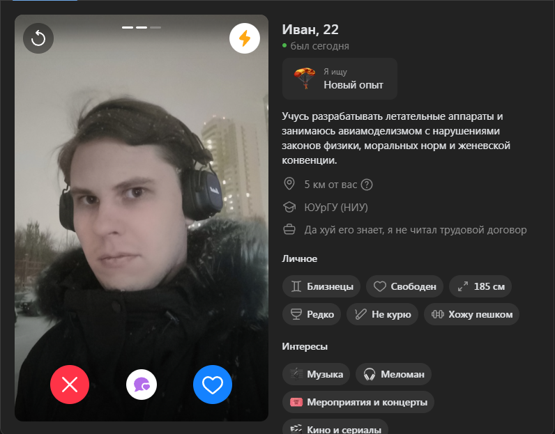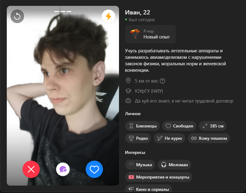 >>808178 Тяны вначале даже не подозревают в нем ничего, он просто такой человек что умеет пиздеть не затыкаясь и врать три короба сходу. Он даже мне врет постоянно даже зная что я ему не верю, он даже самому себе врет. Но тяны то этого не знают. Самое смешное то после близкого знакомства тяны от него уходят потому что инфантил и характера никакого. Но для одноразовых встреч и пикапа хватает хули.