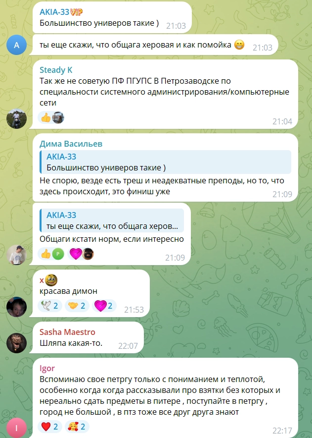 >>710242 База >>708195 Потому что вуз тебя направляет в что то максимально далекое. Меня например направили в метрострой, куда нужно было приебошить к 7 утра что для меня было физически не возможно из пригорода ебаного. Делать там ничего было нельзя, ведь если стажер намотается на вал - всем будет пиздец. По итогу дали распечатанный чертеж и послали нахуй. Денег само собой никто никуда не заплатил. В конце учебы (14 что ли год?) было распределение от вуза. Одна позиция на 20 рыл. 14к в каких то сибирских ебенищах. И таки да мои одногруппники устроили за эту позицию КОНКУРС. Я охуел и даже больше чем охуел.