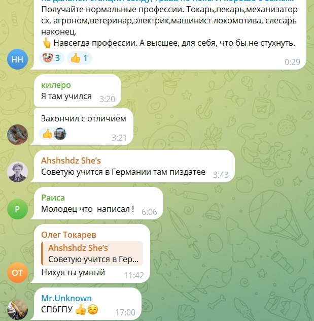 >>706013 (OP) Спасибо моим родителям, они из последних денег отправили меня учиться платно и уже прошло 11 лет, я вышел на уровень зарплаты 200КРуб, причем работа исключительно умественная, тяжелая, но не IT. Закончил бы бюджетный сельский вуз - пиздец, все мои одноклассники кто дотянул институт до диплома либо работают не по специальности разовыми доходами, либо сидят на офисных должностях 50-100КРуб в ожидании конца рабочего дня. Профессии инстутитутов, особенно провинциальных устарели на 50-70 лет.