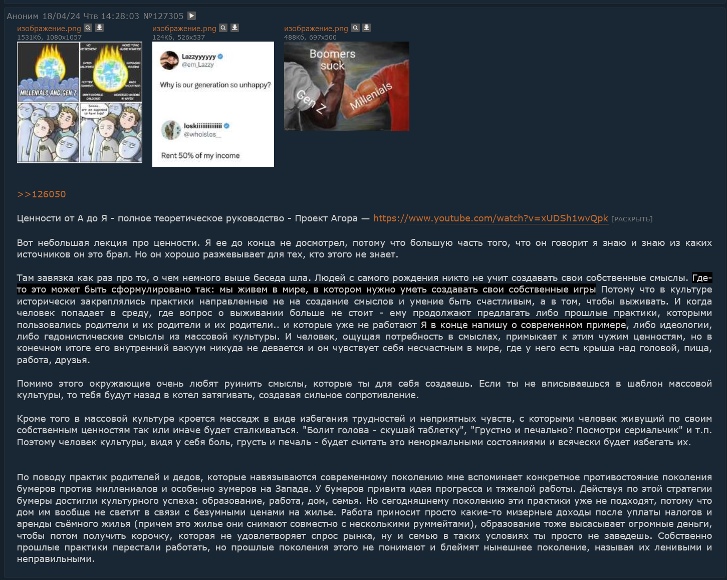 >>706441 >проблема не в школе, она уж такая как есть. Как есть сейчас - это мягко говоря хуевейшее состояние. >проблема в ваших родителях, которые проецируют на вас свои комплексы и всю эту хуиту. посмотрите на них и спросите: живут ли они богато или бедно и помогло ли им их образование? ну и делайте выводы Есть тут зерно истины, но я бы сказал, что все агенты социализации от мала до велика щас устроены невежественно. Родители часто проецируют в воспитании то, что у них самих не получалось. Многим установили вредоносное программное обеспечение в головах и они поколениями его могут передавать. С родителями надо выстраивать рамки и территорию своего комфорта, чтобы не упасть в крайность полного обруба связей(они всё таки большую часть жизни посвятили тебе, пускай и не идеальны) или же другой крайности - гиперопекой.