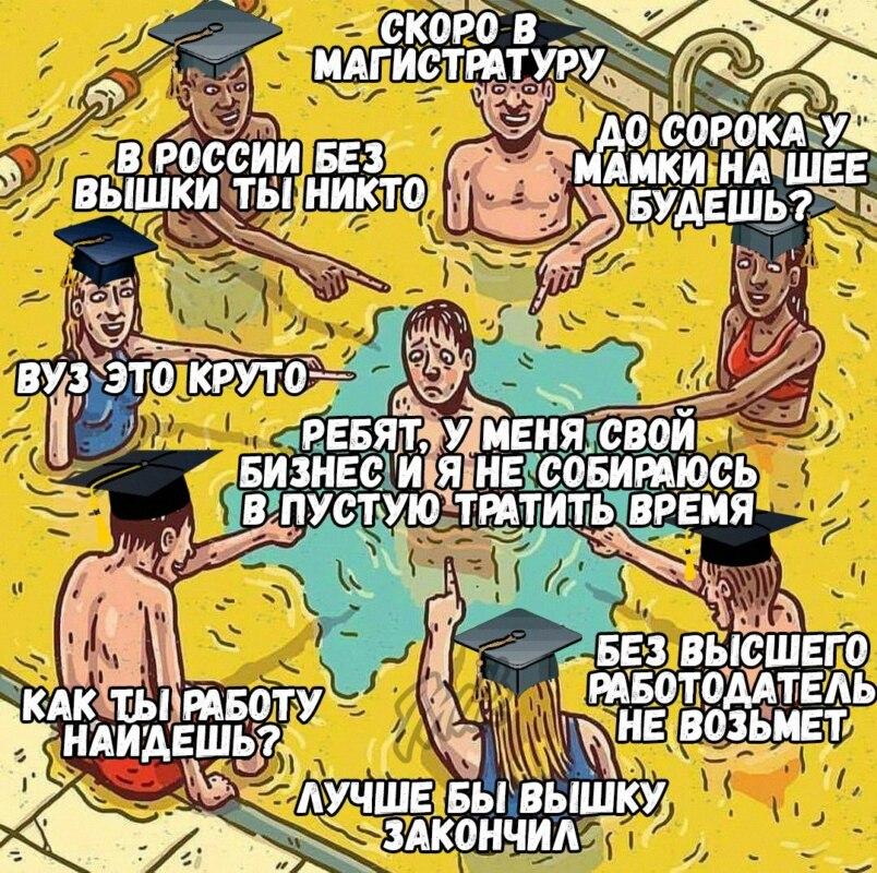Не помню кто сказал: почему образование все время дорожает, если количество студентов растет, а количество выпускников увеличивает конкуренцию на рынке. Оно должно дешеветь. Мэйн проблем в том, что нет никакой школы жизни в принципе. Есть школьно/универовская зубрежка с относительно небольшим коридором для самостоятельного мышления, но школа самостоятельного мышления отсутствует как класс. На этом фоне забавны визги о "самом лучшем советском образовании". Т.е. образовании обо всем и ниочем. Ебучая алгебра, геометрия, физика, химия, литература, история, в объеме выше базового - ебучий балласт, гробящий молодые годы. В школе не учат практическим вещам - как посчитать и оплатить жкх, как рассчитать налоги, пенсию, как сука самому подключить электросчетчик, оформлять бытовые документы и т.д. и .т.п. И пока отличники/хорошисты забиты большими объемами информации, троечники познают базовые правила жизни. Это как чтобы уйти с нелюбимой работы, надо сначала остановиться и обдумать свою жизнь, накопить энергии - но этого не дают каждодневный рабочий загруз и выгорание. Ну и да, раньше до конца 80-х образование гарантировало должность и средний заработок. Но опять, никто из родителей не учил, что на работе надо вести себя так - так, есть говнолюди, есть сплетники, есть выслужники перед начальством, что на старающихся обычно просто едут, а повышают своих/блатных/по другим причинам и т.д. Образование учит в корне одному - быть наемной собакой на цепи, а не думать как свободный волк.