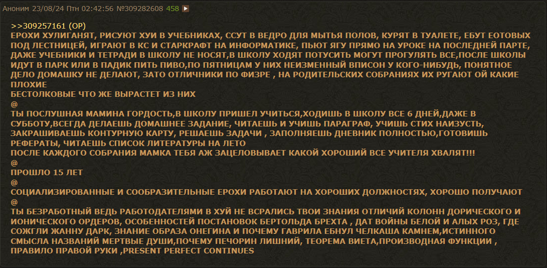 Обсуждения образования обостряются к 1 сентября. Логична. Но самого вопроса это не снимает, ибо благословенная ковидла 3 года назад отлична показала, что современная школа (особенно школа) в существующем формате нахуй никому не уперлась и в неё прекрасно можно не ходить. Сидели двачеры по домам, спокойно учились дистанционно, студентоты даже в ВУЗы дистанционно поступали, сессии сдавали и в магистратуры проникали - и ничего, небо на землю не упало. Я не к тому, что учиться надо дистанционно, но школа, например, в её текущем состоянии нахуй не нужна, а просто учреждение, куда детей сдают, чтобы они там слегка организованно время провели и родителей не доебывали.