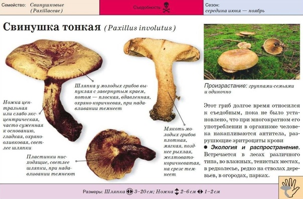 Короче, нашёл гриб (вернее, плодовое тело), который действительно не безопасен к употреблению. Это свинушка тонкая. После его съедения в кровь попадает антиген, который цепляется к эретроциту. Если эротрицит умирает, он цепляется к другому. Если он будет обнаружен иммунной системой, то тебе пизда. Если ты постоянно жрёшь свинушек, то вероятность откинуться повышается.