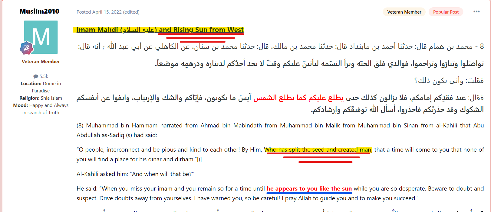 «После того, как ас-Сафаарини упомянул несколько хадисов, связанных с Махди и переданных многими сподвижниками Пророка, да благословит его Аллах и приветствует, он сказал следующее: «Эти хадисы передаются как теми сподвижниками, чьи имена упоминаются, так и теми, чьи имена не упоминаются, а также людьми из поколения таби’инов и из следующего за ними поколения. Из чего мы делаем вывод, что сообщения, повествующие о приходе Махди, передают нам несомненное знание (аль-ильмуль кат’и). Следовательно, вера в Махди является обязательной. Это установлено людьми Знания и является частью акыды Cуннитов».