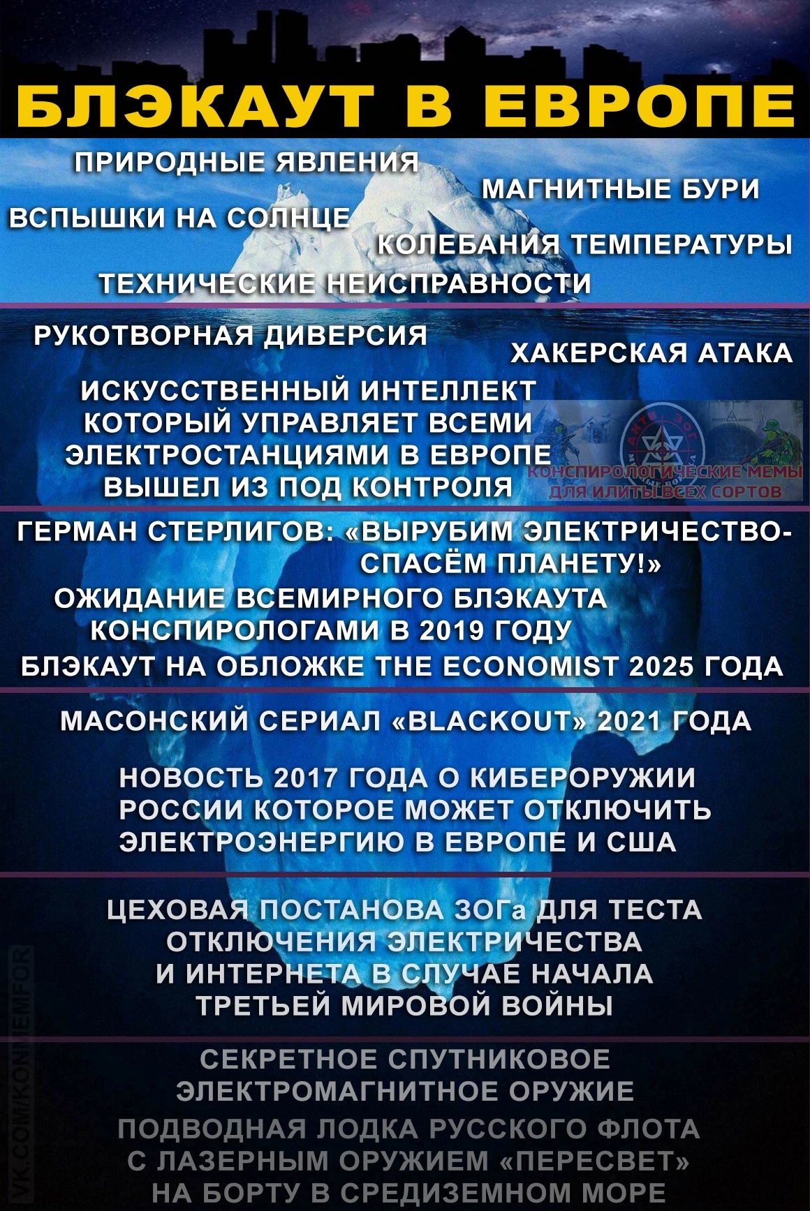 А может это оружие? Глушилка электричества как в сериале "революция"? Провели испытание, высосали колоссальный объем энергии, погрузили целую страну в средневековье, что аж армию пришлось вызывать. Где гарантия, что это не акт будущей агрессии? Включат свою хуйню и будем в темноте срать в пакеты. Подача воды то насосами, которые на электричестве. Кароче думайте, покупайте повербанки, собирайте генераторы из велосипедов. Хотя если это оружие, сосущее электричество , то хоть закрутись педалями, один хуй все будет высосано.