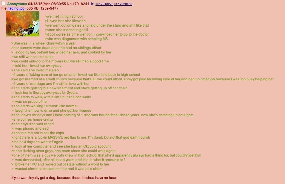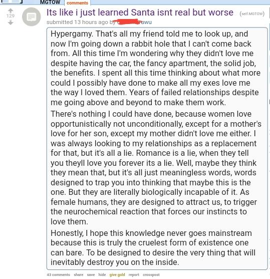 >>907084 >А что если весь хейт мужчин к женщинам исключительно потому что положение женщин в обществе объективно лучше по всем параметрам. Ну да, у меня еще и гендерная дисфория (причем не удивлюсь, что последний гвоздь туда забили всякие инцел - треды с сосаки и МДшники), конечно мне завидно женщинам. Хотя это только половина от причин хейта, селедки воспитывают хуемразей «настоящими мужиками», а всех кто не хочет быть тупым рабом пизды в делириуме «мужыковости» клеймят педиком или еще что похуже.