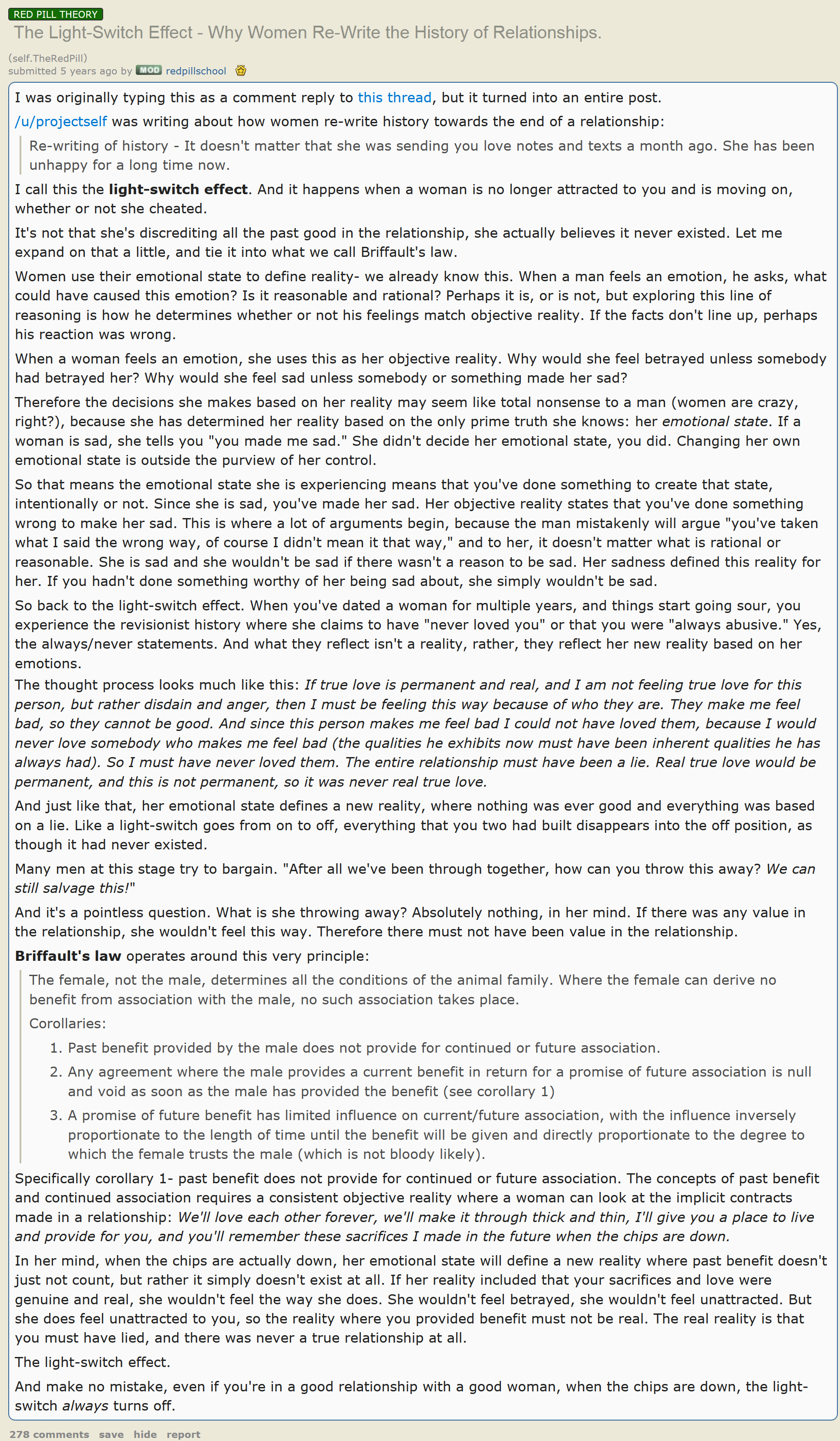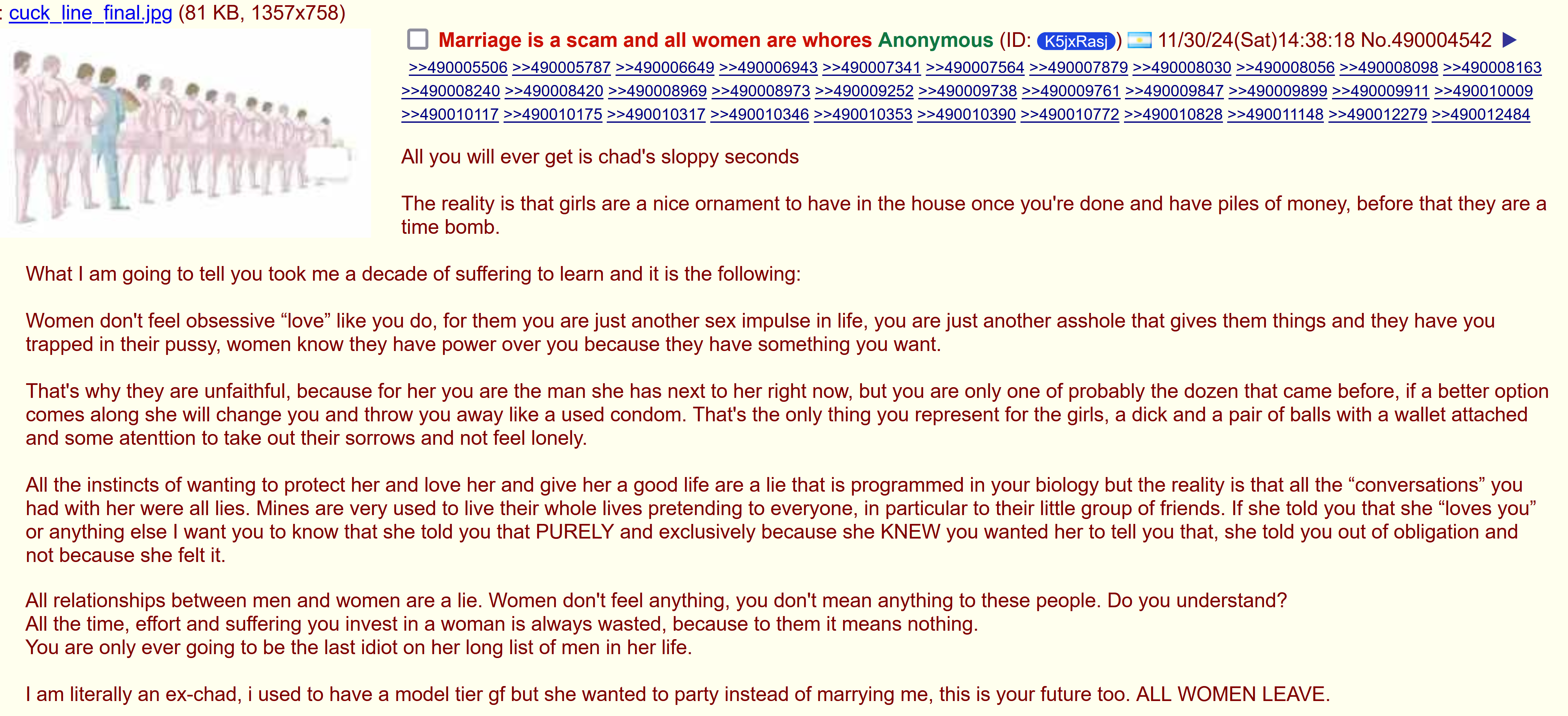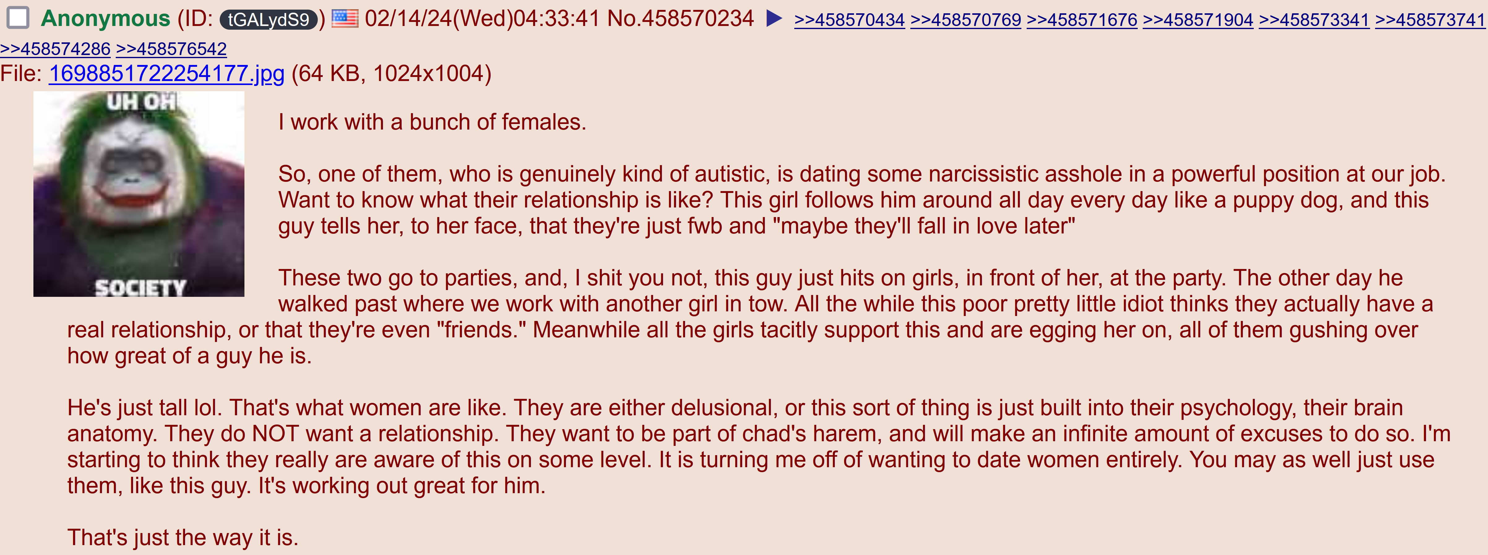 А что если весь хейт мужчин к женщинам исключительно потому что положение женщин в обществе объективно лучше по всем параметрам. К тому же женщины в большинстве случаев привлекательны, мужчины в большинстве случаев не привлекательны, всратаны разной степени. Красивых мужчин очень мало, особенно в подростковом возрасте когда почти все тян очень красивы и сексуальны. Просто эта ненависть является рессентиментом, завистью, страданием от несправедливости. Мы ничего не можем с этим поделать, остается только ненавидеть Я не буду приводить тут миллионы мемасов, постов анонов со всех стран мира в доказательство моей позиции, она очевидна - положение женщин лучше.