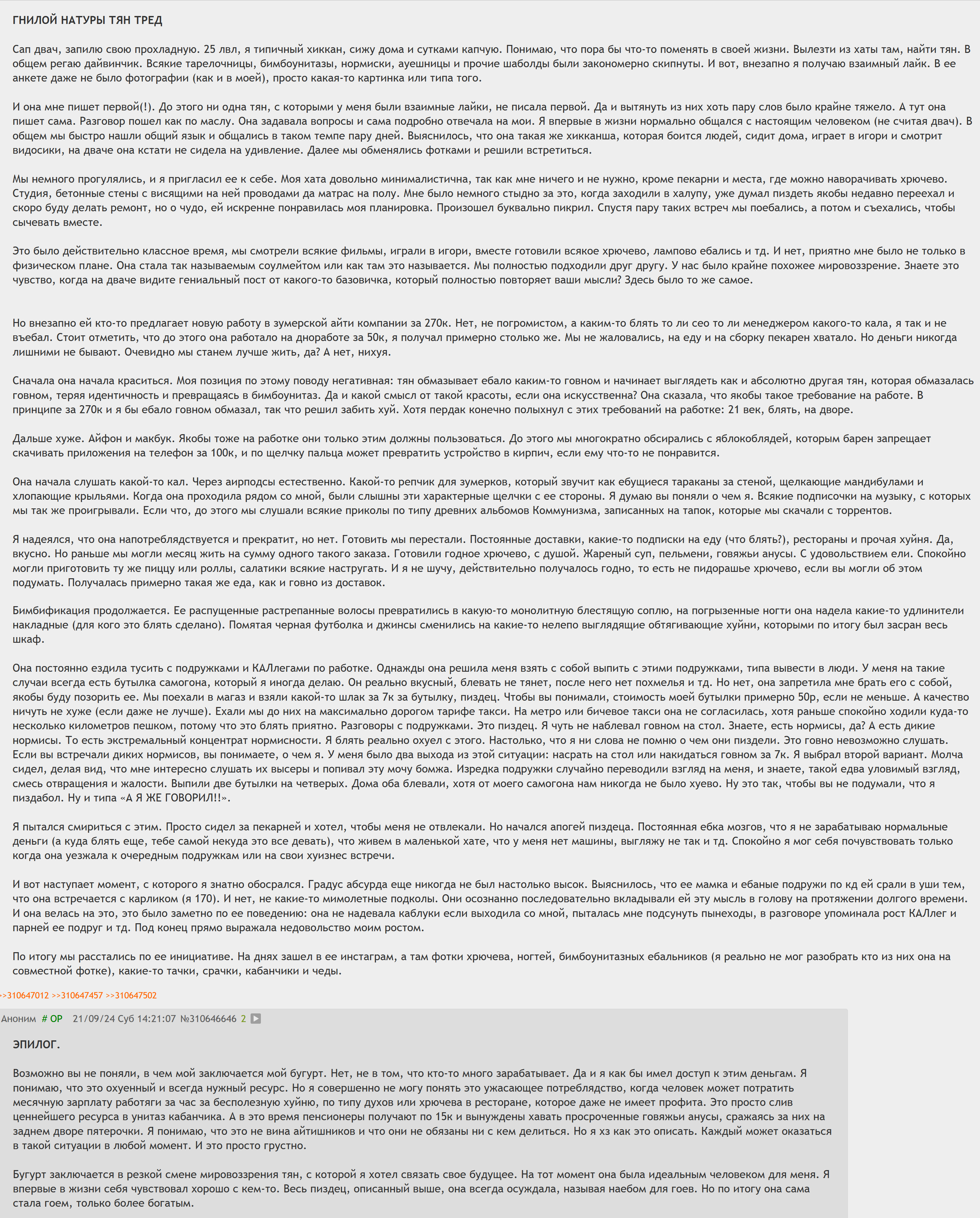 Конечно, ты баб и не видишь вокруг, кроме всяких жирух, фемок и совсем уж генетического мусора! Баб навалом, просто в твоей среде обитания их нет, потому что они по своим трехкомнатным квартиркам сидят, живут жизнью рантье сдают 4-5 бабкиных хаты, фоткают жопы для онлифанса и скамят мамонтов.