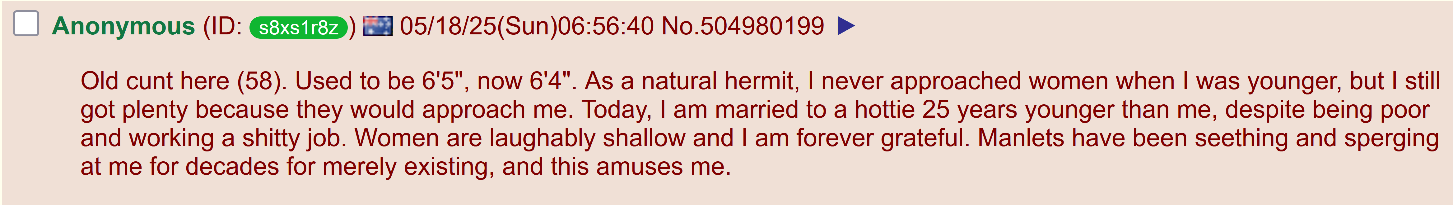 Я например не самый всратый, тянки сами всегда липли. Когда 13-21было липли в т.ч. старше меня, причем нормально так старше. В 30+ наоборот младше. Сейчас я нахуй побрил голову, отрастил бороду и хочу максимально не привлекательным быть. Одеваюсь нормально, по творчески.
