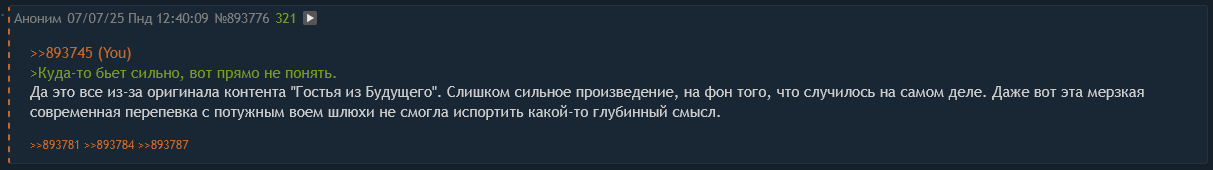 Вот когда я был помладше я думал ну фильм и фильм. Че там, картинки какие-то, музыка, ничего страшного. Сейчас я понимаю НАСКОЛЬКО это вообще программировало и продолжает программировать людей. Жесть