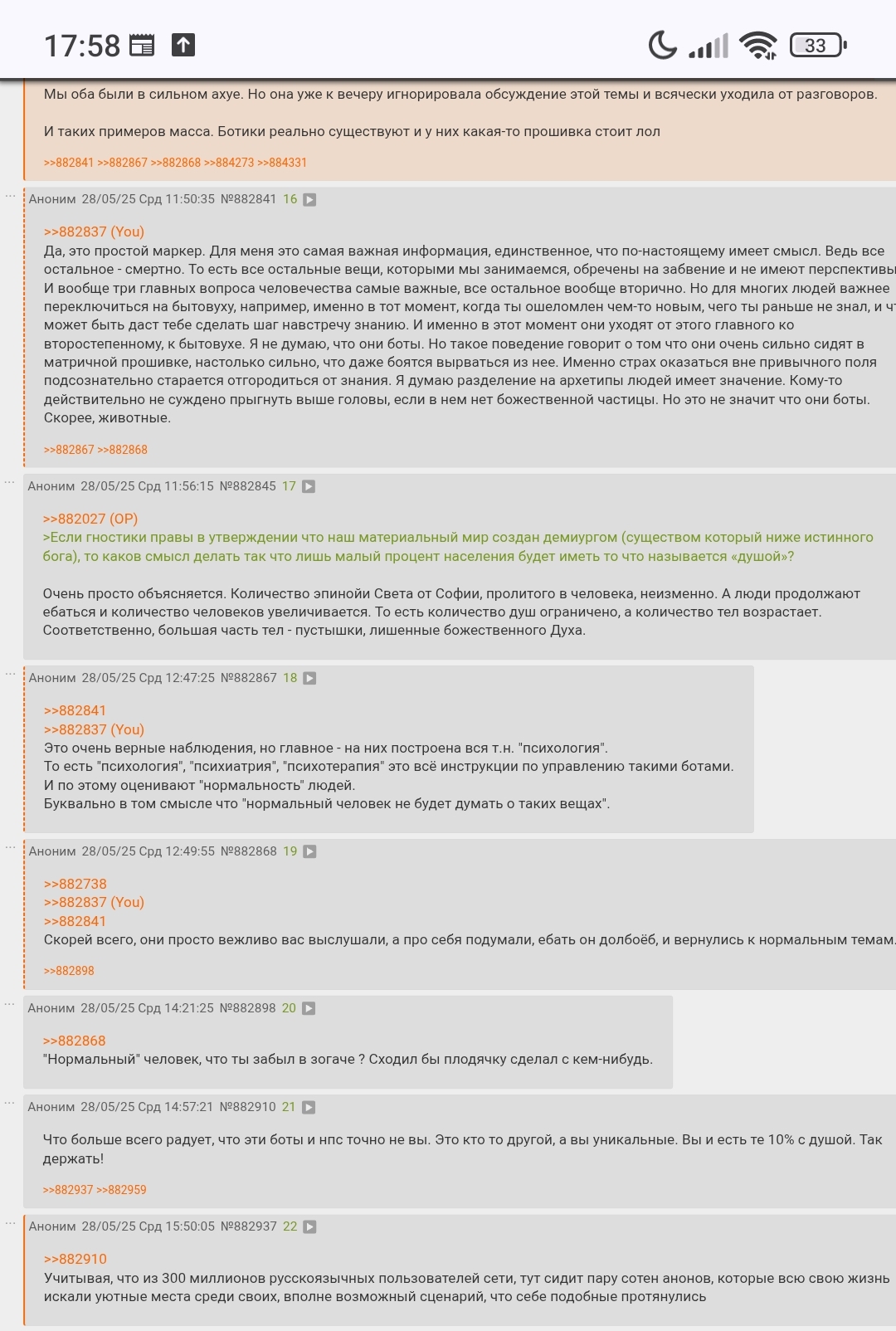 >>882837 Да, это простой маркер. Для меня это самая важная информация, единственное, что по-настоящему имеет смысл. Ведь все остальное - смертно. То есть все остальные вещи, которыми мы занимаемся, обречены на забвение и не имеют перспективы. И вообще три главных вопроса человечества самые важные, все остальное вообще вторично. Но для многих людей важнее переключиться на бытовуху, например, именно в тот момент, когда ты ошеломлен чем-то новым, чего ты раньше не знал, и что может быть даст тебе сделать шаг навстречу знанию. И именно в этот момент они уходят от этого главного ко второстепенному, к бытовухе. Я не думаю, что они боты. Но такое поведение говорит о том что они очень сильно сидят в матричной прошивке, настолько сильно, что даже боятся вырваться из нее. Именно страх оказаться вне привычного поля подсознательно старается отгородиться от знания. Я думаю разделение на архетипы людей имеет значение. Кому-то действительно не суждено прыгнуть выше головы, если в нем нет божественной частицы. Но это не значит что они боты. Скорее, животные.