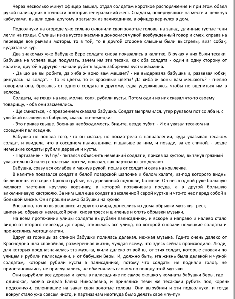 Тосковал я там; все отхлипать не мог... Только стал привыкать - глядь, бора и нет - одно сизое гарево. Опять пришлось побродяжить. Подыскал я себе лесок - хороший лесок был, частый, темный, свежий <...> Днем и ночью вокруг все трещало что-то. Сперва я думал - свой брат, леший там тешится; окликнул, прислушался. Трещит себе, громыхает - нет, не по-нашему выходит. Раз, под вечер, выскочил я на прогалину - вижу, лежат люди - кто на спине, кто на брюхе. Ну, думаю, поразбужу их, расшевелю! Стал я ветвями встряхивать, шишками лукаться, шуршать, гукать... Битый час провозился- все ни к чему. А как ближе взглянул, так и обмер. У того голова на одной красной ниточке висит, у того вместо живота - ворох толстых червей... Не вытерпел я. Завыл, подпрыгнул и давай бежать...