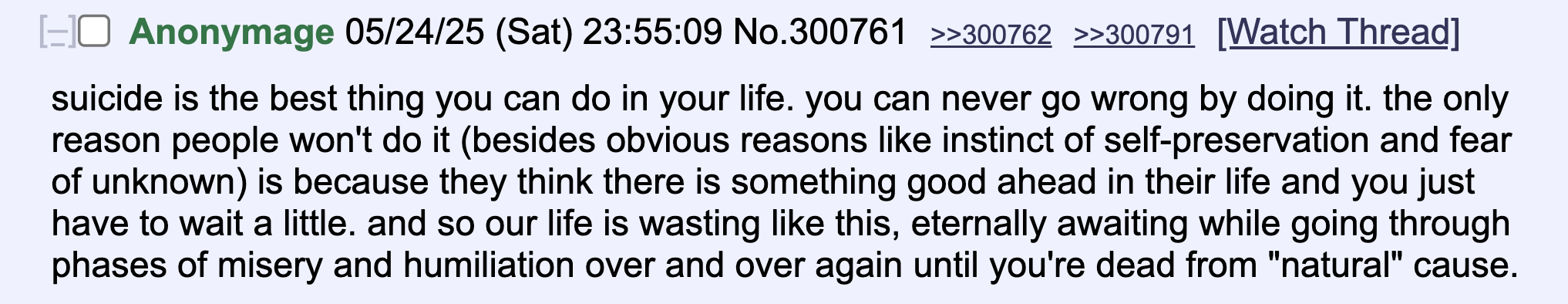 >>896762 Самый прикол в том что просветленная аскеза, точнее ее образ в массовой культуре, из которой ты его почерпнул - это тоже байт матрицы, стимулирующий тебя подавить желания и сидеть бесконечно несчастным и зажатым и прилагать неимоверные усилия чтобы "не повестись", пока подавленные желания выедают тебя изнутри, генерируя стабильный гаввах каждую секунду.