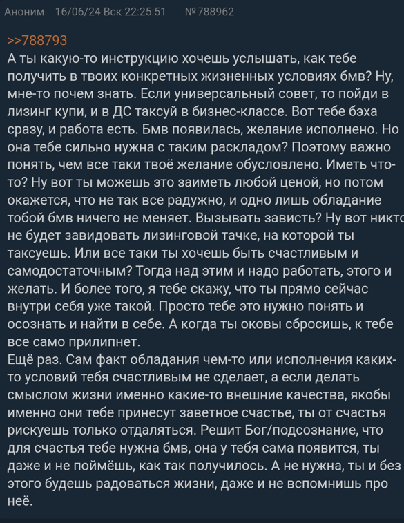 >>891667 >Никакая удача и никакие исполненные желания не сделают вас счастливым. Да иди нахуй, чел выше писал что до сих пор всего хватает. Я про машину писал.