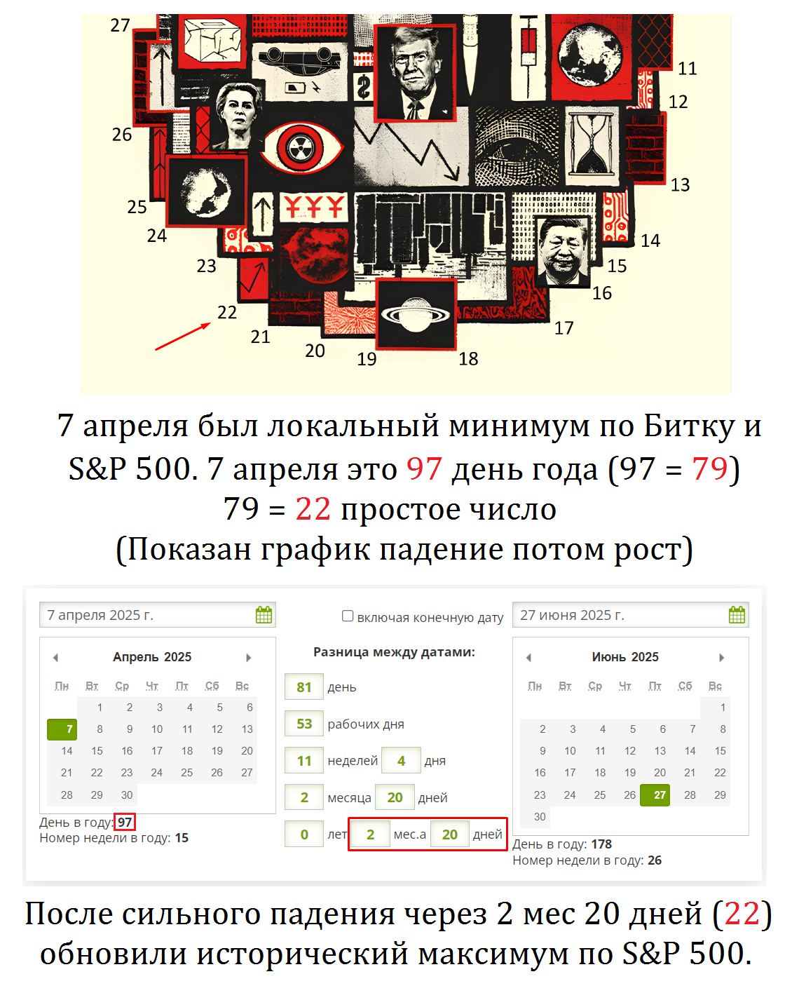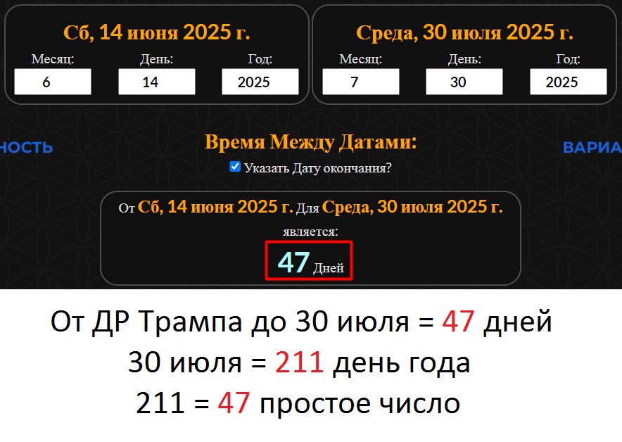 Как говорил ранее, все глобальные события завязаны на Трампа. И так совпало, что от ДР Трампа до 30 июля = 47 дней, и 30 июля — это 211 день года, а 211 — это 47 простое число.