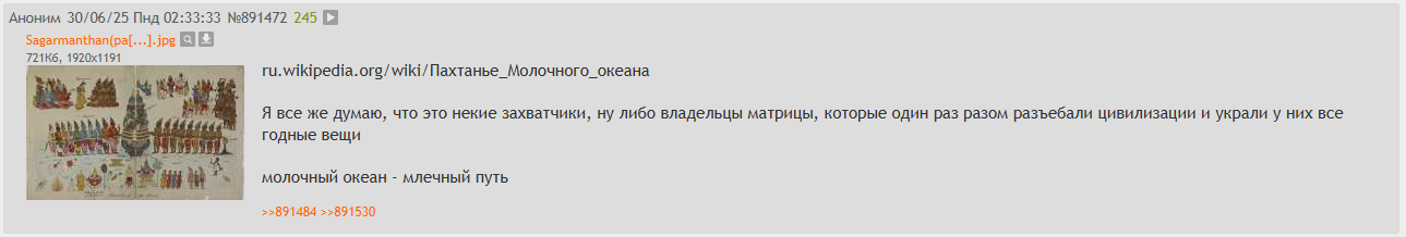 >>910011 Перестань писать глупости, да про гигантов писали многие, но вот эти гиганты размером с планеты, галактики полный бред и то, что Шива там использует планеты как колеса или что Вишну в котором все живут - надо понимать метафорически царь, все те, кого в своём сердце ты решил принять как своего зятя с течением времени уже оставили своё тело. Уже прошло 27 чатур-юг. Те, кого ты выбрал уже давно ушли, ушли и их сыновья, внуки и другие потомки. Ты даже не услышишь об их именах. Пока мы с тобой разговаривали уже почти наступил конец 28-й эпохи, и скоро наступит эпоха Кали. Так что ты должен отдать этот драгоценный камень в руки другого мужа, ведь теперь ты одинок, а твои друзья, министры, слуги, жёны, родственники, армии и сокровища уже давно были сметены рукой времени >Затем Какудми и Ревати возвратились на Землю. Они были шокированы изменениями, которые там произошли. Изменилась не только окружающая природа, но, спустя 27 чатур-юг, человечество оказалось на гораздо более низком уровне развития, чем в их время. «Бхагавата-пурана» описывает, что они нашли расу людей, которая «уменьшилась в росте, стала слабее, в том числе и в умственном развитии.»