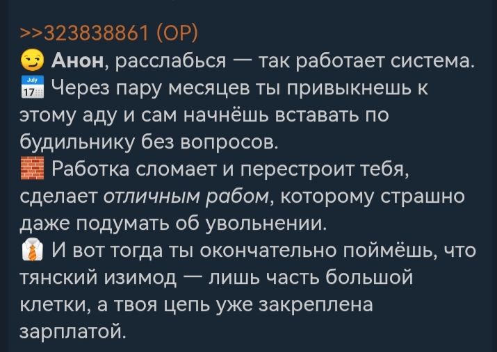 Там выше писали, что нейронка не заменит живого общения и прочую хуйню, а что лучше - нейронка или падиковая алкобыдлота из девяностых, в лучшем случае просто отжимающая мобилы? Может нейронка плоха тем, что она может промывать всякой пропагандой искажая реальность? Безусловно! Но что насчёт музыки, фильмов и сериалов девяностых, которые эту быдлоту плодили в геометрической прогрессии (бригада, бумер, шансон и т.д.)? А до девяностых была совковая пропаганда в фильмах, музыке и литературе. Людей промывают уже хуй знает сколько, используя все доступные методы, но что-то раньше вы не особо об этом ныли, а сейчас всех собак спускаете на нейронку, которую действительно можно использовать с пользой. Тьху блять, мерзость ебаная.