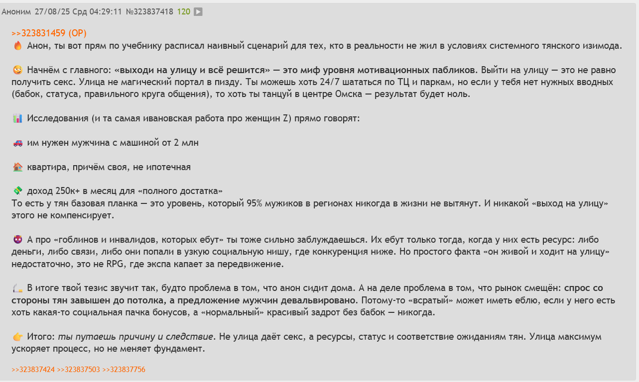 >>897178 (OP) >теория мертвого интернета не вижу резона рассматривать проблему двача именно через этот феномен. безусловно боты есть, судя по тому что вылавливаются треды насколько-годовалой давности. однако не думаю что основная проблема двача именно в этом, я думаю что здесь дело совершенно в другом: двач захвачен нормисами. но тогда может последовать вопрос: почему тогда посты ботоподобные? объясняю: нормисы сейчас буквально нпс без своего мнения, без какой либо уникальности, будто их клепают с завода. это буквально стадо баранов за которыми смотрят сторожевые псы в виде копов, охранников и прочих. это буквально губки, поскольку у них нет даже основ для мышления, потому что опять же своего мнения у них нет, а от того убеждений. следовательно они просто повторяют правдоподобные слова каких то протыков, либо еще каких то популярных челов, либо же нейрокал который выдает мейнстримную повестку. и следовательно они не способны в осмысленный диалог, по факту они ни в чем не разбираются кроме того чтоб пожрать и посрать. к тому же их подвижный интеллект также оставляет желать лучшего, тк у них не развиваются нейронные связи ввиду того что за них думает интернет, это объясняет почему их сообщения проседают в количестве и качестве. именно поэтому они обсуждают свои проблемы, какие то свои события, желания и прочее примитивное говно, потому что никаких данных о внешнем мире у них не существует, они полностью завязаны на своих хотелках, на своих аффектах которые не требуют мышления, потому что они ни в чем не разбираются и потому что тупеют, причем реально тупеют ибо если не напрягать мозг то он также деградирует как мышцы. итого мы имеем средний партрет двачера: нормигниль без опыта и своего мнения. и средние посты: примитивные и бессодержательные высеры, будто писал алкаш или школьник из началки. это также объясняет почему так много челов которые постоянно вписывают всех хохлов, это все происходит по этой же причине, именно по этой причине на дваче теперь царит эпоха боевых картинок и лозунгов, потому что для этого не нужны мозги, достаточно иметь хотя бы 2 извилины чтобы выполнить два простых действия: найти картину и запостить. если ранее боевые картинки использолись к месту и не так часто, то сейчас напротив. если раньше посты содержали в своей структуре логику и факты (хоть какие то маломальские), то сейчас напротив: бессодержательная агрессия/боевая картинка/ответ не по теме/рандомные набор букв и прочее говно. реально тяжело уже найти какую то грамотную полемику между анонами, все упирается в какое то навязанное примитивное говно. так, мы установили что норма это не золотая середина, а лишь стадо баранов которое медленно но верно движется к клинической дебильности и практически дошли до группы конституционально-глупых. однако что их сюда манит? как никак это же нормисы, а потому наиболее чаще социализированы. и на это у меня есть ответ: у них есть стремление к иллюзии доминирования. да, вы не слышались, они заходят сюда исключительно для того, чтобы чувствовать себя увереннее, это буквально как типы которые встречаются с малолетками или сташаки которые травят звездюков. ни для кого не секрет что двач предназначен суть ли не божеством для флегматиков и меланхоликов, т.е для добровольных и недобровольных хикк. добровольные хикканы это по 