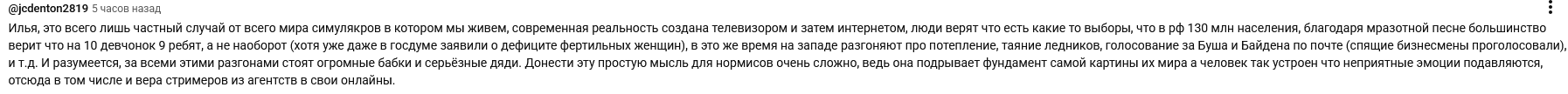 Dead internet? Да какое-там. Вон как в вм агенты тайной полиции бугуртят, когда напоминаешь им, что ютуб заблокирован или твиттер x. Раньше говорили: неееееет, ты не можешь говорить, что он незаконно заблокирован, он просто замедлен. Потом начали, ну ты что нищий, ты не можешь у агента тайной полиции впн купить? Как одни все синхронно начали давить курочкина. Как другие работающие в поле начали говрить про дудя и все повторили что это интервью они не досмотрели до конца. Что его не стоит смотреть, это они все сказали.