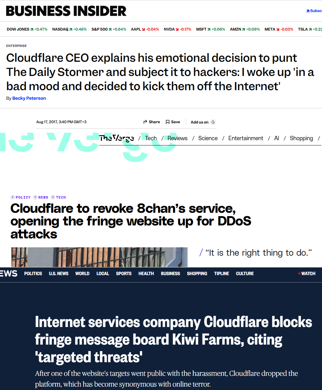 >Клаудфаре отключает сайты? От интернета? Шиза. Ой ли? А еще не стоит забывать что случилось с интернетом, когда клаудфаре лег. С ним лёг и весь интернет. Наверное очень хорошее место этот идеальный свободный интернет, который зависит от одной компании и хотелок его сеошника. Очень удобно получается. мы же не от интернета их отключаем, а просто не предоставляем наш сервис от дудоса, ой, без нашего сервиса ты в перманентном дудосе, вот незадача. Но ты и дальше верь про децентрализованый свободный интернет. Просто инструмент, ничего не блокирует.