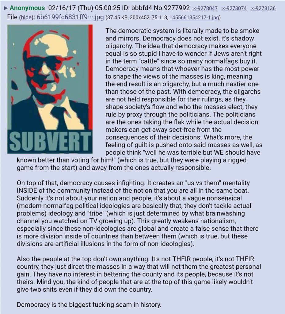 Демократия – театр для гоев. В сколь-нибудь крупной стране она не может работать в принципе. Конкретно на Западе - медиа-кратия, где выборы используются для легитимации марионеток капитала, который протолкнул их кандидатуры на выборах, через подконтрольные СМИ. Власть осуществляется через прокси-кукол, а кукловоды остаются в тени и не отвечают за последствия. Власть принадлежит крупному капиталу, контролирующему СМИ, а обыватель промывается под любую повесточку за квартал максимум.