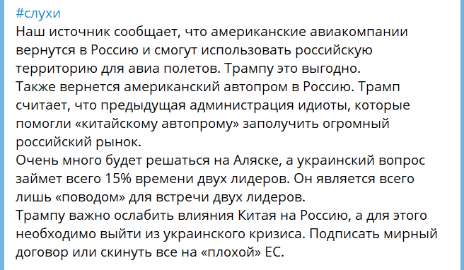 Авиационная блокада снята не будет; Поставки запчастей для Боингов не разблокируют. Однако России удастся снять угрозу американских тарифов против Индии и Китая. По этому Трамп скажет, что он Путина припугнул и тот согласился на прямые переговоры с Зеленским, а если бы он не согласился, то были бы тарифы против Индии и Китая.