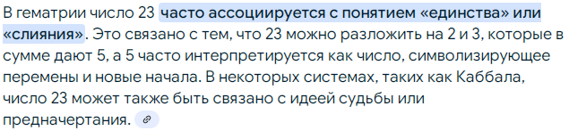 >>904735 >23 Да все верно. Но... >Пикрил 1 666 >Пикрил 2 День равноапостольной Марии Магдалины празднуется 22 июля, т.е. 22 числа 7 месяца. https://ru.wikipedia.org/wiki/Мария_Магдалина >Пикрил 3 Координаты Анкориджа с интересной комбинацией "911" >Пикрил 4 Гематрия Анкориджа целиком во всех вариантах состоит из цифры "9".